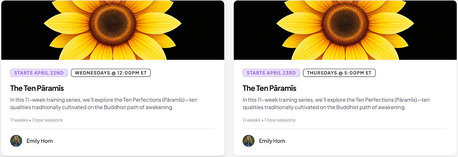 If you’d like to check out The Ten Paramis–without yet becoming a member of the Pragmatic Dharma Sangha–you can join the 1st session on either Wednesday, April 22nd or Thursday, April 23rd.